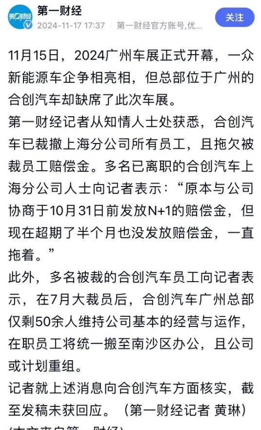 据第一财经,合创汽车已经裁撤了其上海分公司的所有员工,并且拖欠了被裁员工的赔偿金。