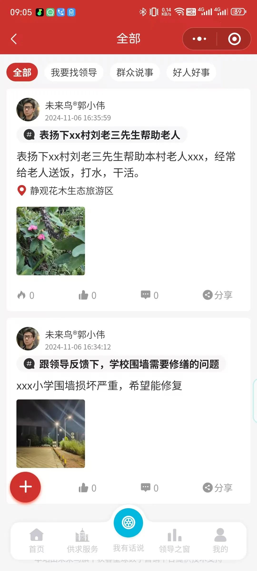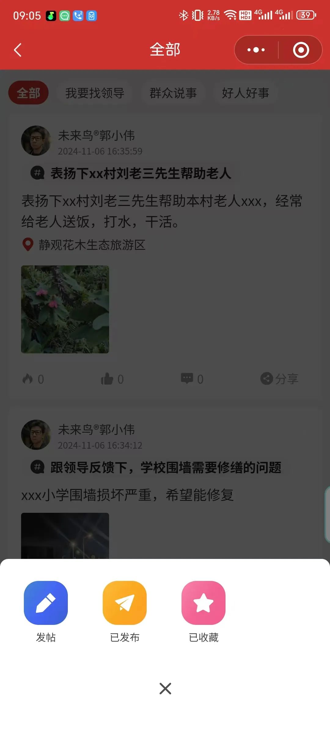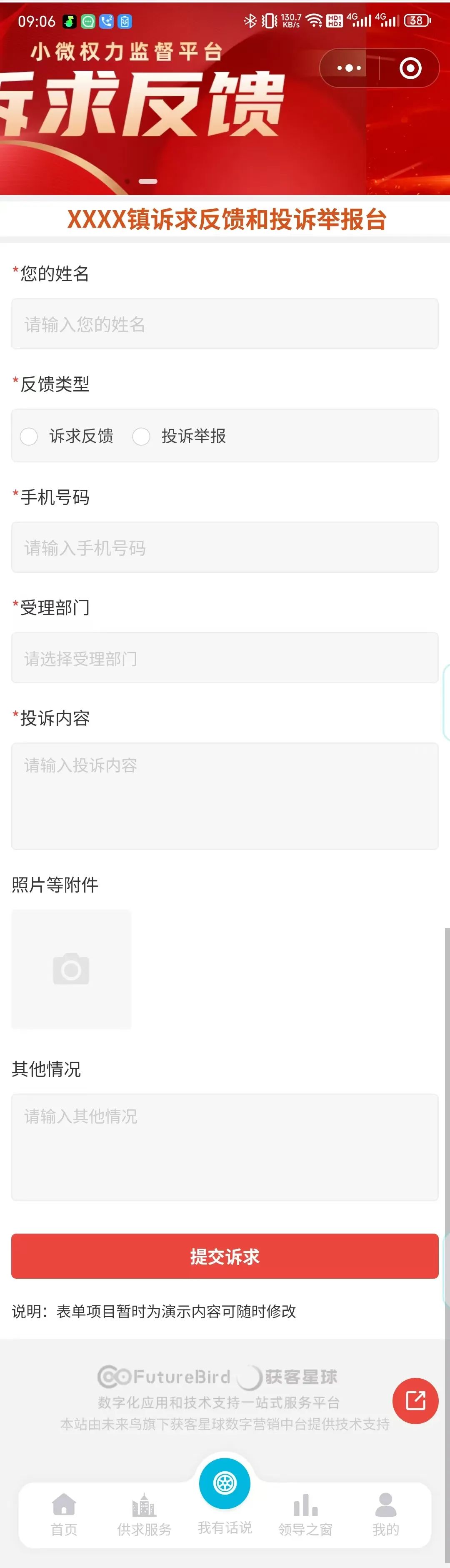 可以自定义增加,我要找领导,群众说事,好人好事,等微社群能力,方便群众通过社区来反馈各种问题