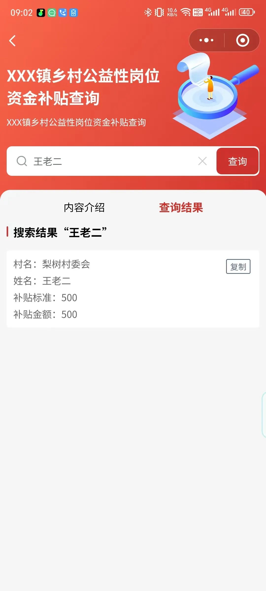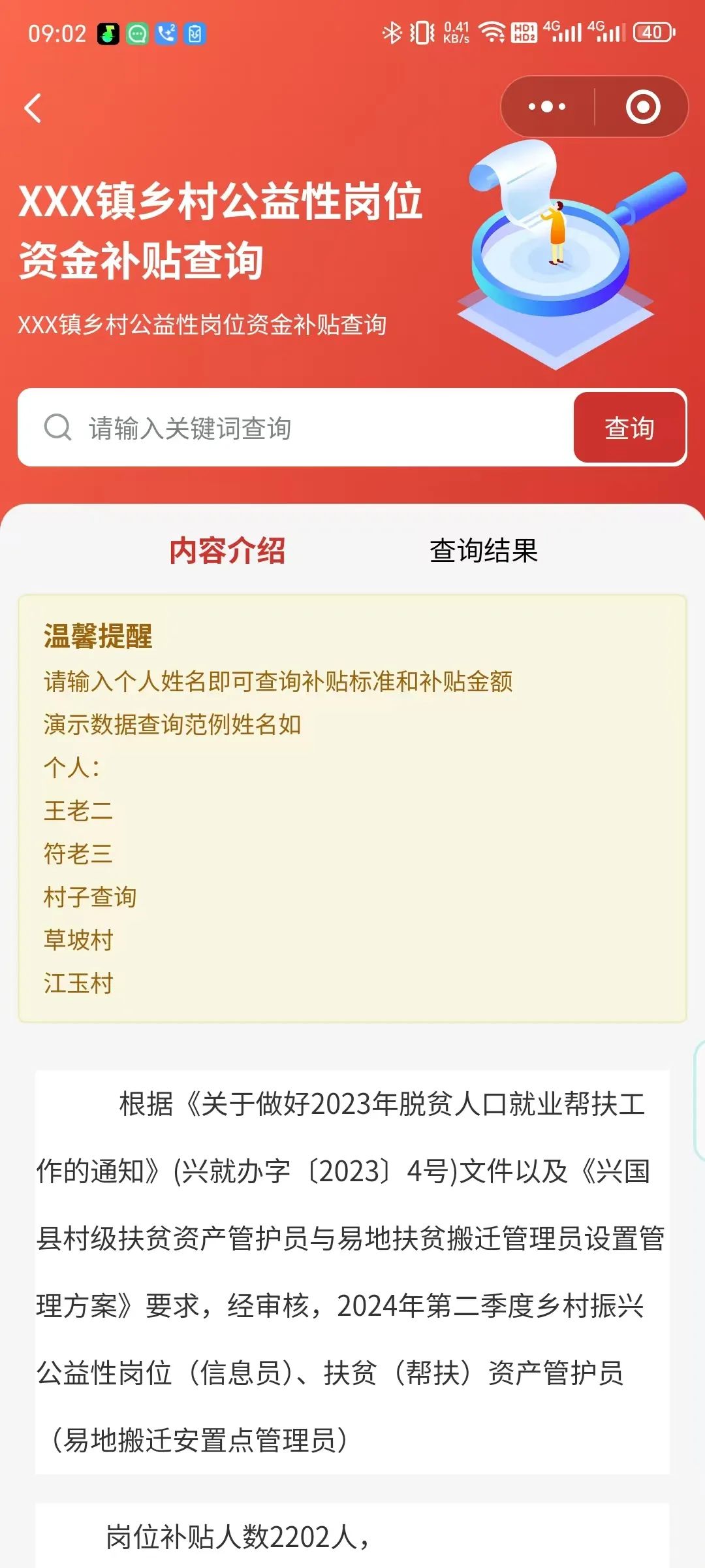 在后台可以导入任意表格文件,设计前台模板,即可实现数据查询,群众输入自己的名字或村名,即可查询到具体信息。