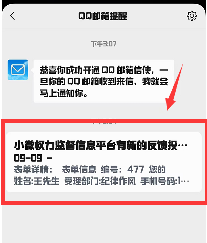 平台收到群众反馈的举报投诉内容,将会第一时间通过后台设置的处理人员的QQ邮箱和微信联动第一时间发送提醒消息,通知工作人员去处理,而不用随时盯着后台