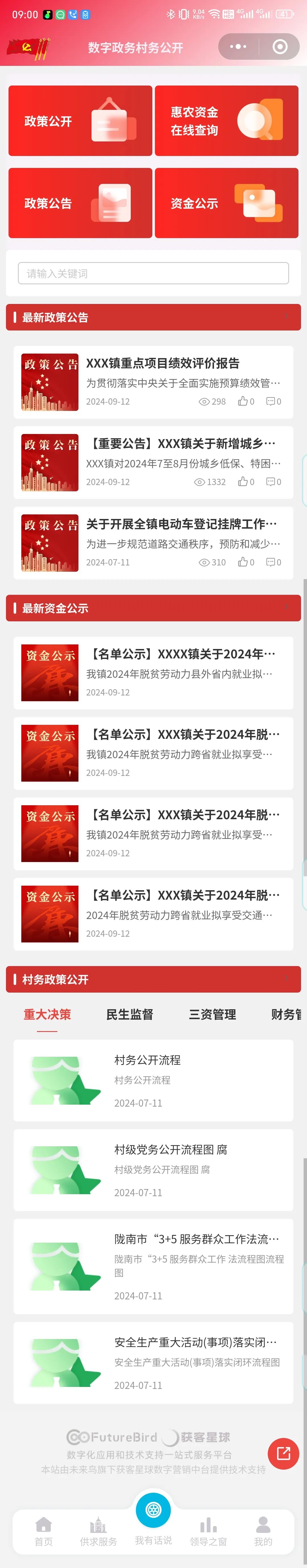 本栏目由村级内容组成,也可以按自己的需求来自定义增加或删除,一般为村级政策流程公开,惠农资金产需,政策公告和资金公式组成。