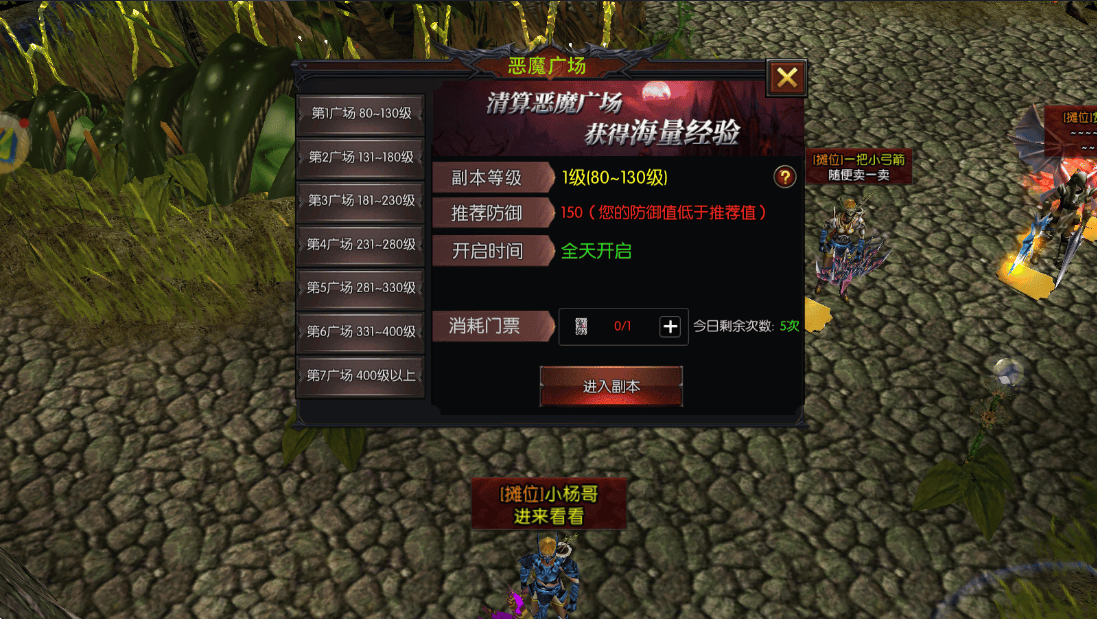 恶魔广场:60级解锁,每日可挑战多次,限时15分钟,波次推进模式,每5波出现精英怪,最终BOSS恶魔统领掉落灵魂宝石与玛雅宝石。推荐阵容为1剑士+2输出+1圣导师,组队经验加成30%。