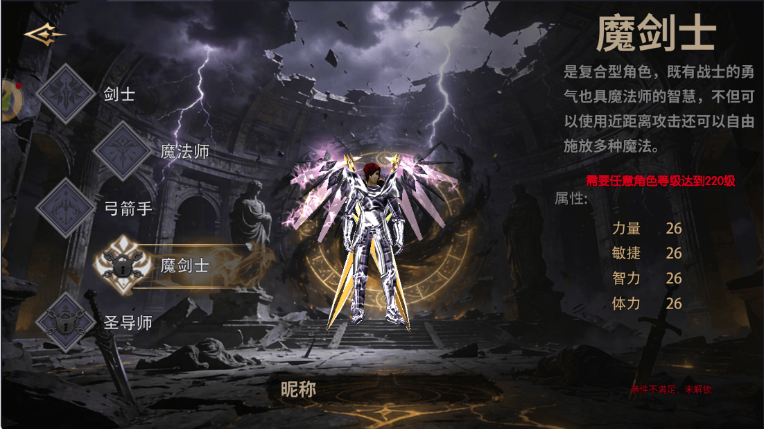 魔剑士需220级解锁,是物法双系输出的职业,兼具近战与远程优势,单挑能力强,操作难度中等,适合有一定基础的进阶玩家。加点需力量与智力均衡分配,少量补敏捷。解锁后优先升级双系核心技能,如魔剑斩、旋风斩等。魔剑士在后期的高阶副本、世界BOSS、PVP竞技等场景中表现出色,但前期需要积累资源,不建议新手玩家前期强行解锁。