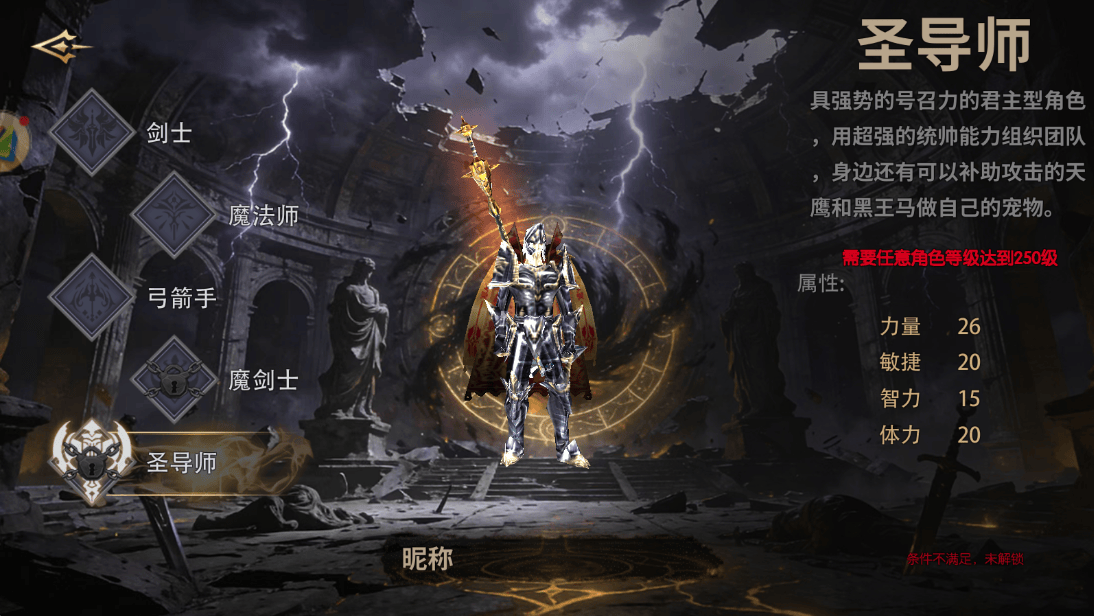圣导师需250级解锁,是团队辅助与指挥定位的职业,拥有增益buff、控制技能,还能统领战盟,适合喜欢社交、带队玩法的玩家。加点核心属性统率>智力>力量,后期重点堆统率至185点。圣导师在战盟团战、攻城玩法中作用不可替代,能为团队提供强大的支援,但单人作战能力较弱,依赖组队配合。