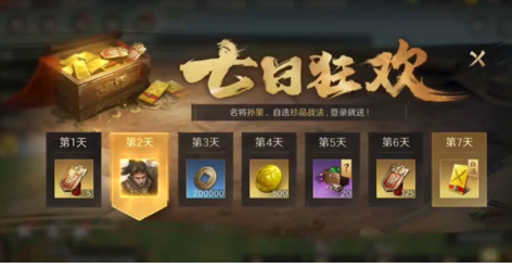 接下来就是七日狂欢活动,这个活动可以说是专门为新人准备的福利盛宴。第二天就送橙将孙策,孙策可是三国时期的一员猛将,武力值超高,有了他,在战场上那就是所向披靡。后续还会赠送自选战法包,战法在游戏中可是决定战斗胜负的关键因素之一。大家可以根据自己的武将和战略需求,选择最适合的战法,大大提升队伍的战斗力。很多新手在拿到这些福利后,都感觉自己一下子就有了和老玩家抗衡的资本。