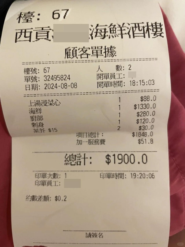 从楼主上传的账单来看,当晚她们叫了一份88港元的“上汤浸菜心”以及价值1,330港元的海鲜,另加120港元的“厨部”加工费和120港元的“刺身”加工费,再加上每位15港元的茶位费和加一服务费,总共1,900港元。