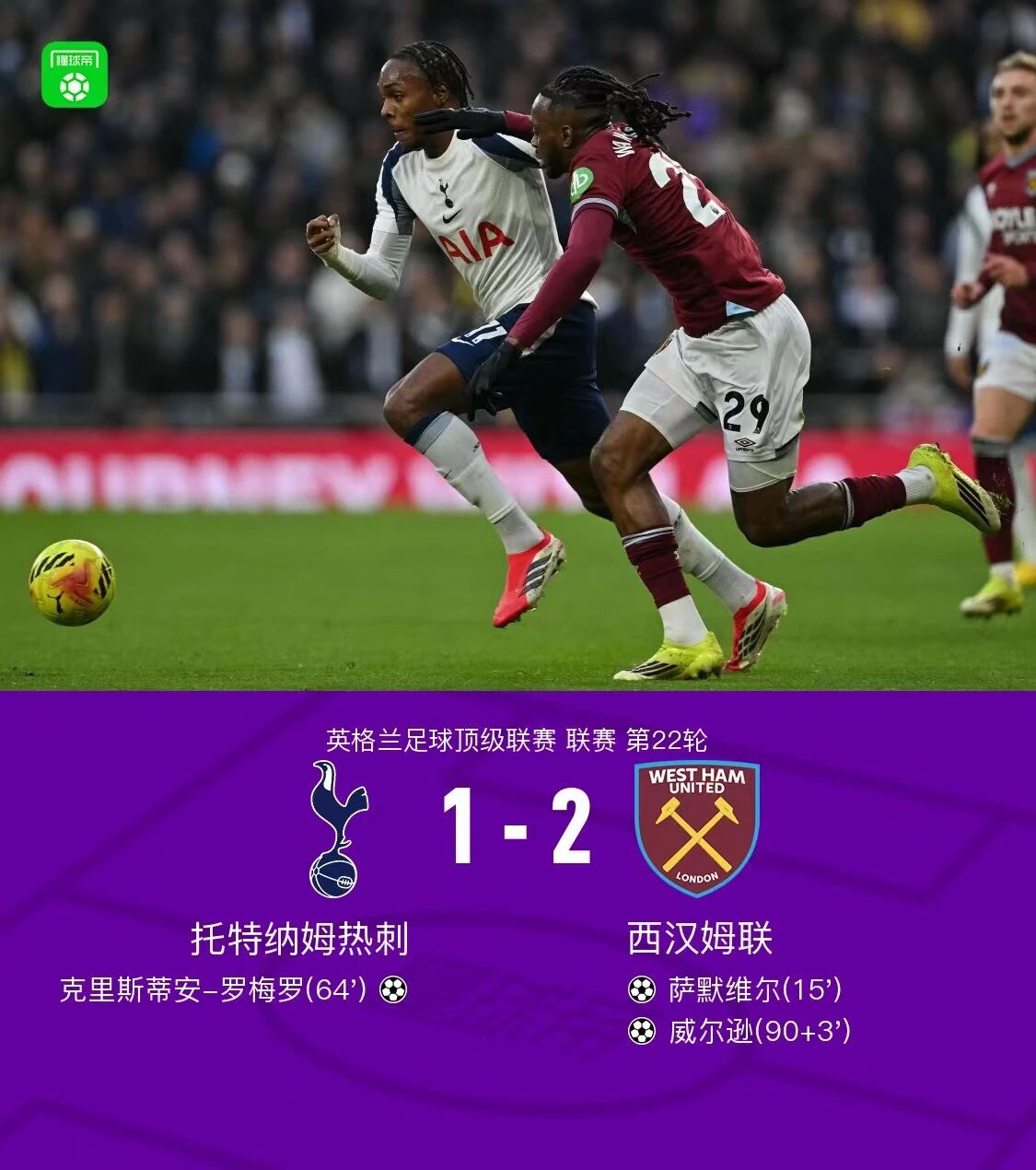 本场比赛中利物浦去年夏天天价引入的中场核心维尔茨延续了上场比赛的表现,本场比赛做出多次过人尝试,成功3次,送出3次关键传球并打入一球。可惜其他队员把握机会的能力差了一筹,最终仍未能取胜。而伯恩利则是在保级的路上再积一分。不过如今仅14分的他们距离保级仍有8分差距,下赛季恐怕很难留在英超。四、热刺遭遇三连败在这场比赛中西汉姆联在第15分钟便先声夺人,萨默维尔成功破门。下半场第64分钟,热刺中卫罗梅罗扳平比分。然而在补时阶段威尔逊破门完成绝杀,热刺就此已五轮不胜,三轮全负。