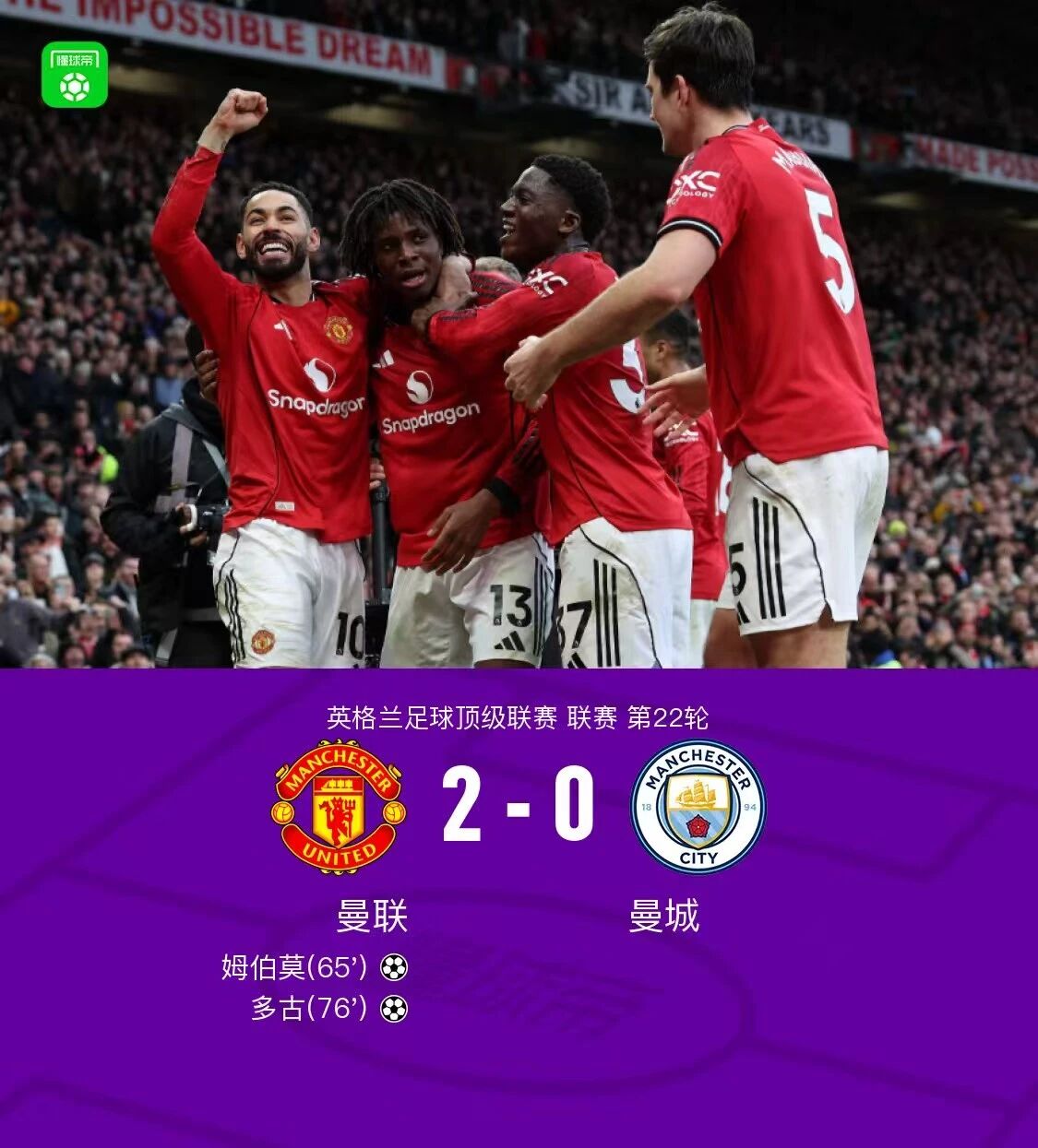 一、曼市德比北京时间1月17日晚20:30的这场德比大战可以说超出了许多人的意料。曼联在之前四轮不胜,而曼城则是取得两连胜。双方不同的状态以及曼城近几个赛季远超曼联的表现也是令许多人都坚持曼城会赢得本场比赛的胜利。然而结果却令不少人都大跌眼镜。曼联在下半场比赛第65,76分钟分别由姆贝乌莫和多古进球,最终2:0战胜了曼城