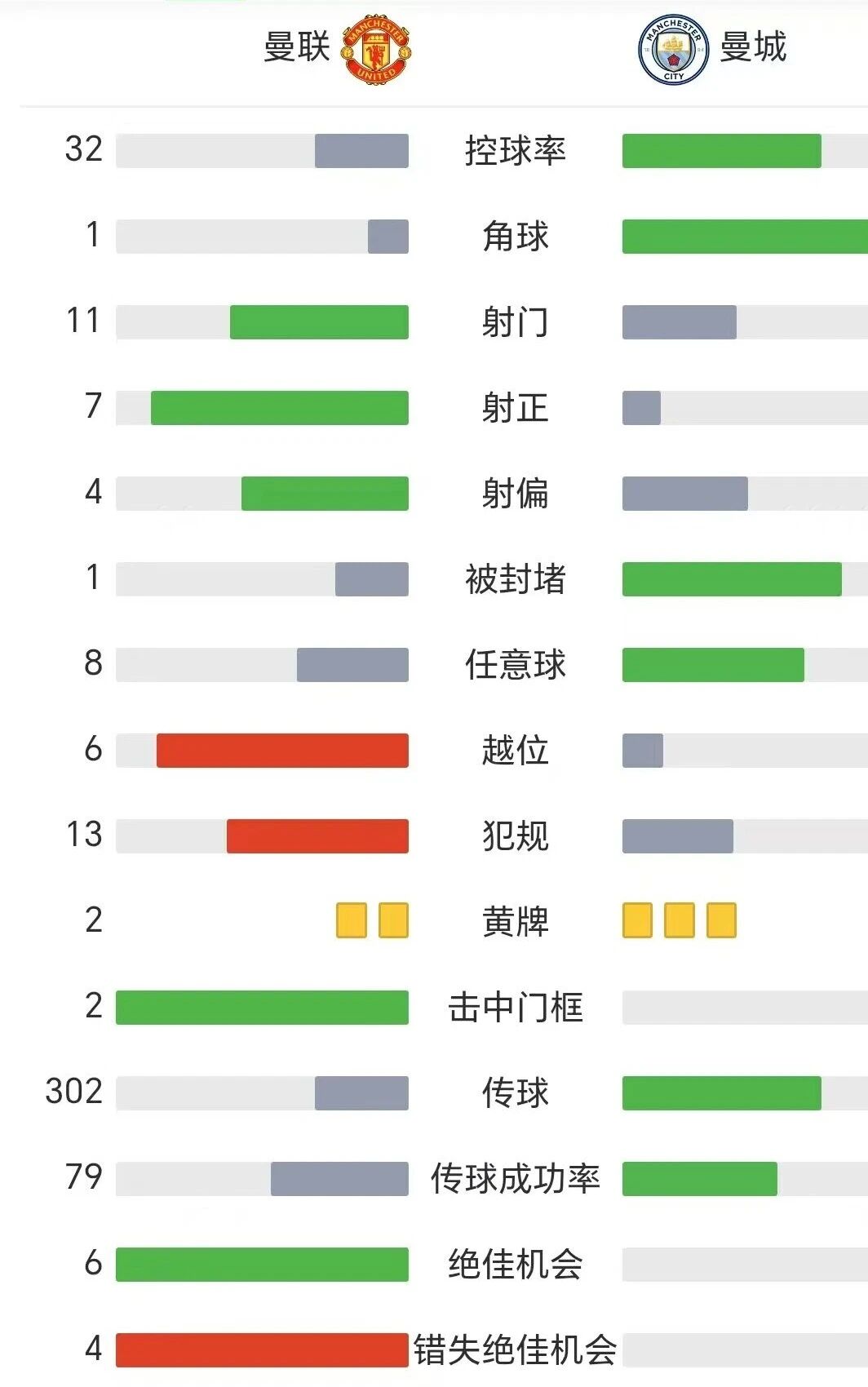 本场比赛中曼城仍然是得势不得分。他们虽然控球率接近百分之七十,但是射门次数及射正次数却明显低于德比对手(7:11,1:4)。而在绝佳机会创造上曼城更是一次都没有,而对手曼联却创造了高达6次的绝佳机会。若非多纳鲁马高接抵挡,恐怕曼城将收获一场惨败。因此曼联绝对称得上本场比赛的胜利。
