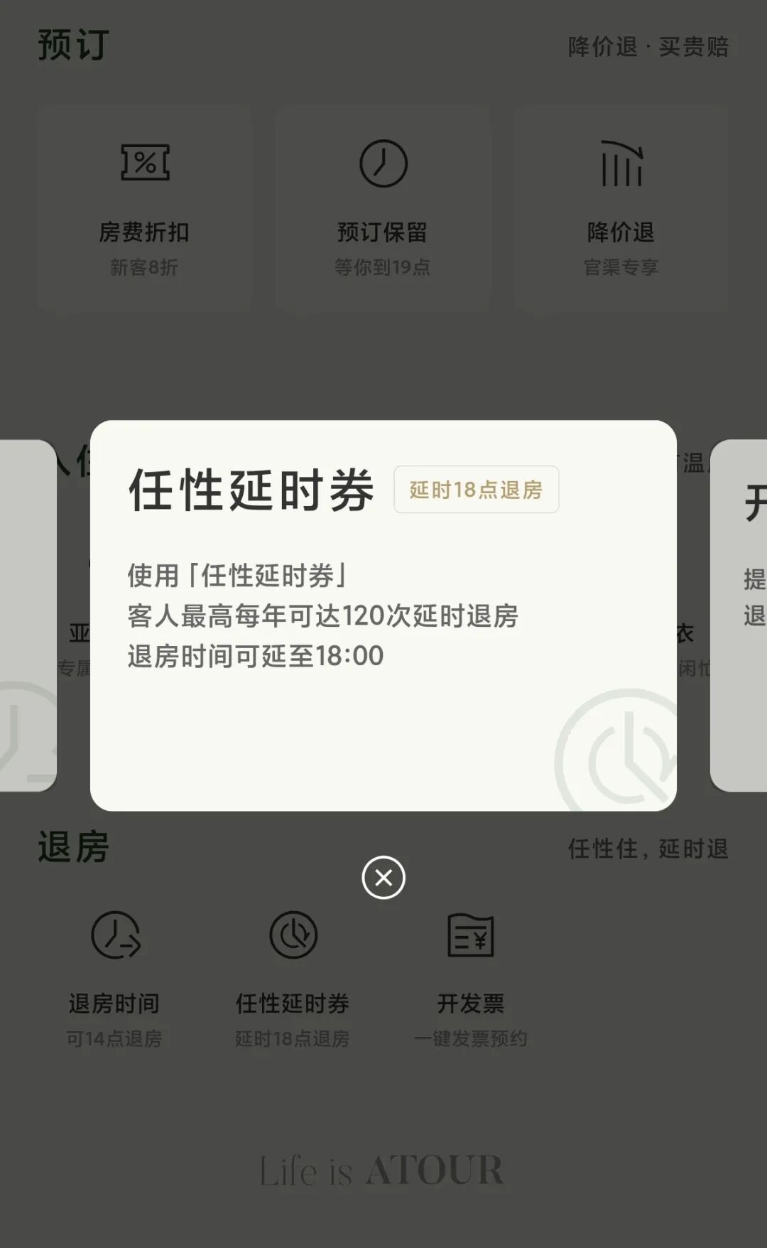 使用这张券之后,原本下午两点退房的亚朵顾客,可以顺延至下午四点退房,如果顾客使用多张延时券,最晚可在下午六点退房。