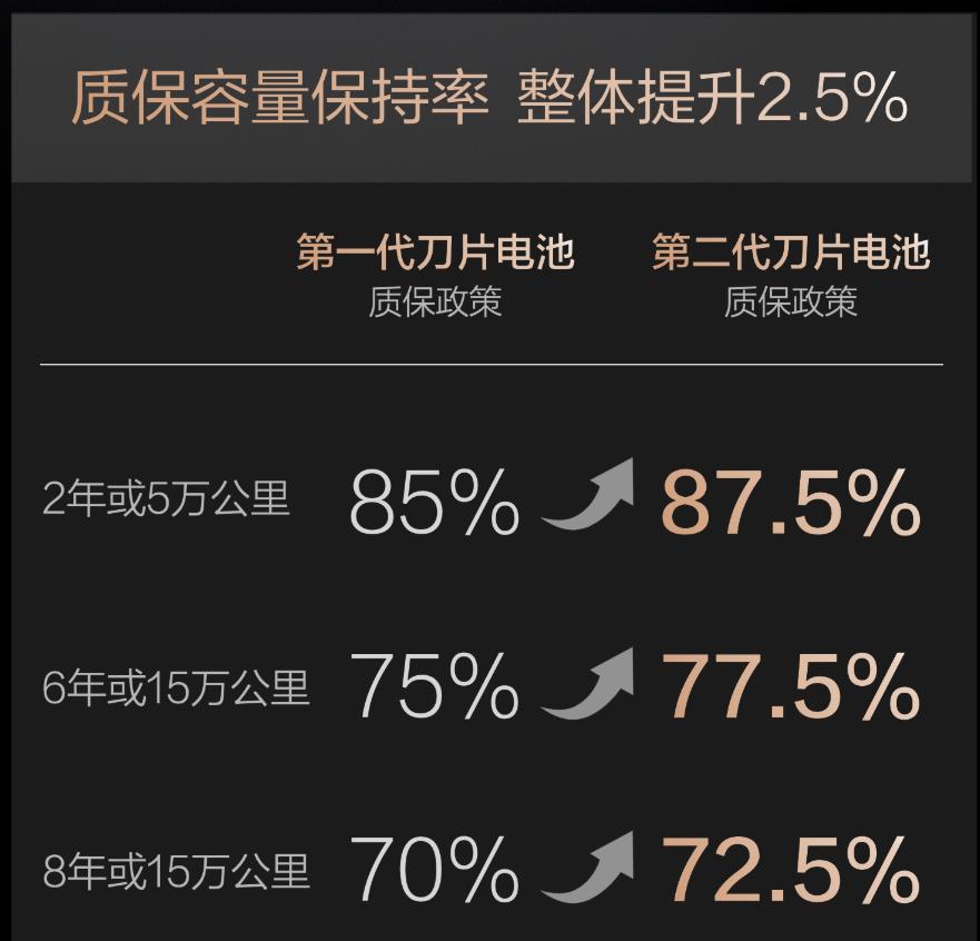 如果说技术参数是纸上谈兵,那质保政策就是真金白银的表态。比亚迪这次宣布:第二代刀片电池质保的“容量保持率”整体提升2.5%,电池容量低于77.5%就免费包换,电芯依旧是“终身保修”。注意这个数字:77.5%。这意味着什么?意味着你用了很多年后,电池容量衰减到这个线以下,比亚迪给你换新。