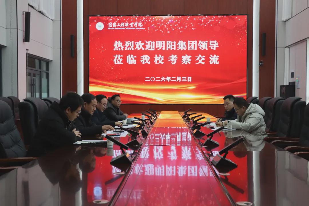 罗勇和曾照宽先后发言。罗勇在发言中,针对集团领导前几次来校对接达成的合作意向,提出了深化校企合作的务实建议。他表示,产业学院建设是一项系统工程,需循序渐进、稳步推进;在课程设置方面,集团可提供专业培训资料与教学视频,助力学校优化课程体系;在运维岗位人才培养上,推行“毕业证 + 技能证书”制度,鼓励学生考取相应的技能证书,集团也将优先录用持证的优秀毕业生。同时,将派人参加学校2026届毕业生春季专场招聘会,开展企业宣讲,吸纳更多优秀人才加入明阳集团。曾照宽介绍了河南明阳智慧能源有限公司的建设运营、产能规模以及核心产品等情况,彰显了企业在区域新能源产业发展中的强大实力和重要地位。他表示,下一步可利用河南明阳公司在信阳设立的新能源人才培养基地,与学校共同组织开展新能源专业学生的实践、实习、研学活动。