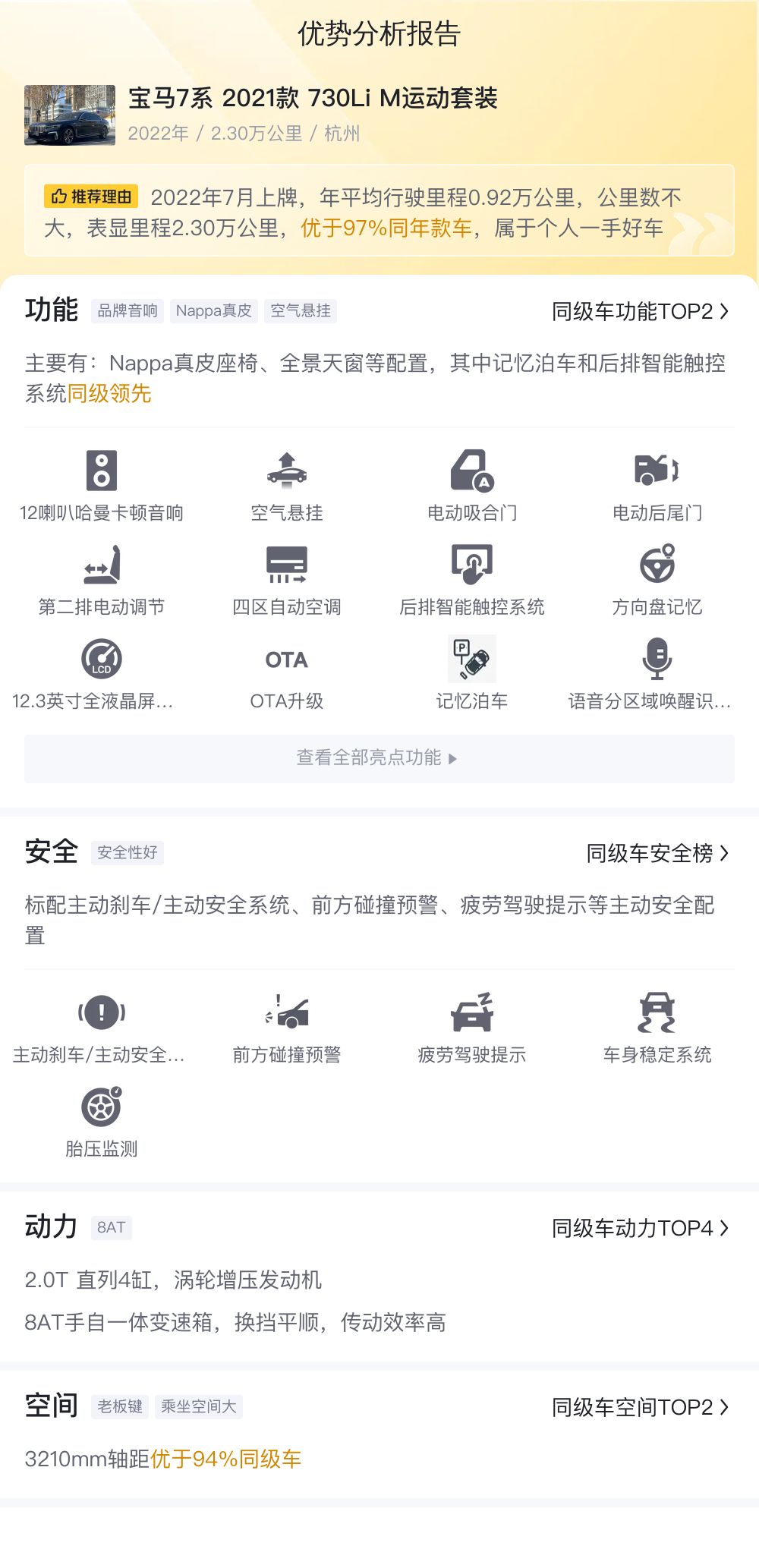 除了车况部分,相信很多车友也比较关注这辆车的配置部分。从安全配置方面来看,标配车道保持辅助系统、车道偏离预警系统、车身稳定系统等主动安全配置,配备6个安全气囊,被动安全配置优于90%同级车。从空间方面来看,3210mm轴距优于94%同级车。从动力方面来看,2.0T 直列4缸,涡轮增压发动机,8AT手自一体变速箱,换挡平顺,传动效率高。从舒适配置方面来看,主要有Nappa真皮座椅、全景天窗等配置,其中记忆泊车和后排智能触控系统同级领先。