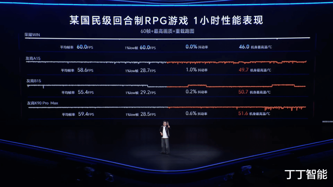 发布会上还少不了 “拷打友商” 的环节,游戏帧率稳定性对比下来,荣耀 WIN 确实占优。