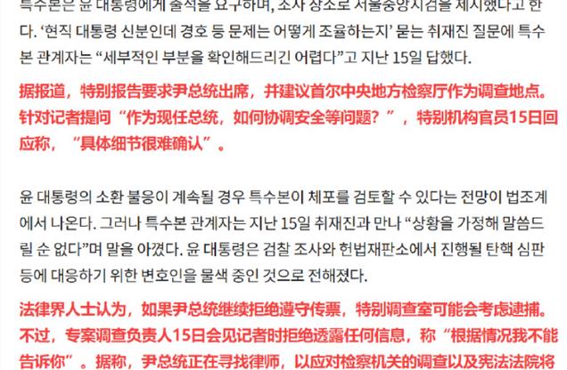 而且尹锡悦不去接受调查也是有说法的,比如就有记者提问,作为现任总统,如何协调调查中的安全问题呢?特别调查本本的官员回应是“细节无法确定”。当然,尹锡悦也没有闲着,他目前正在着手组织一个律师团,注意不是请一个律师,而是一个律师团。团长为广播通信委员会前委员长金洪一。这说明尹锡悦根本没有乖乖认命,接下来还要打“法律战”,而随着未来韩国政坛的不确定性,尹锡悦的命运到底如何还很难说。