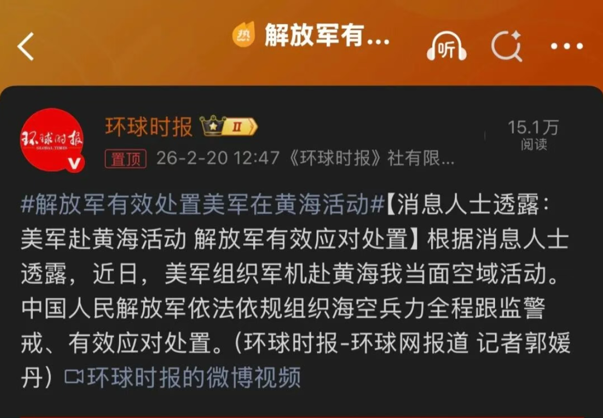 当天的环球时报,也在第一时间证实了韩媒披露的关于中美战斗机在黄海某空域上空对峙的消息。在报道中指出,近日,美军组织军机赴黄海我当面空域活动。中国人民解放军依法依规组织海空兵力全程跟监警戒、有效应对处置。