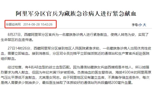 2014年8月28日,新华网报道西藏阿里军分区接到地区人民医院紧急求助,一名藏族急诊病人出现休克性贫血,安排战士紧急献血挽救了病人生命。