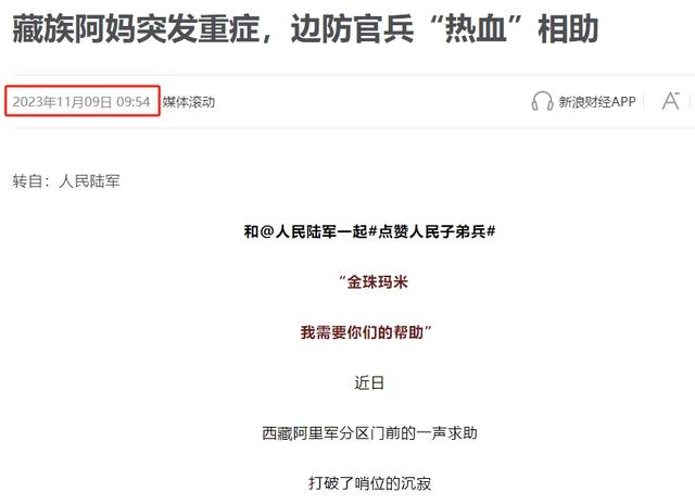 2023年10月30日上午,阿里军分区接到求助,一名藏族阿妈突发疾病,手术急需B型血,医院血库存不足。阿里军分区迅速组织官兵前往医院献血,使得手术顺利进行。