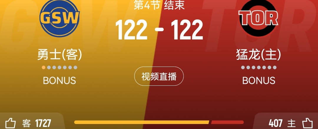 比赛到了白热化阶段,猛龙111-113落后2分。这时候,库里站了出来,果断命中三分,比分120-113。话音未落,猛龙连得5分,分差又回到3分。最后一刻,猛龙将比分追平了。常规时间122-122,加时赛。