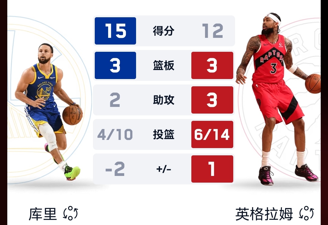 数据来看,库里半场得到15分,投篮10中4,其中三分球3中2,命中率略有回暖,罚球5中5,正负值-1,看来权威机构对库里的表现还是不太满意。