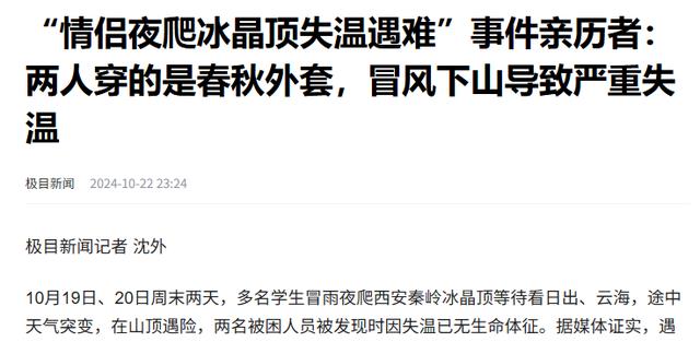 极目新闻2024-10-22 ——“情侣夜爬冰晶顶失温遇难”事件亲历者:两人穿的是春秋外套,冒风下山导致严重失温