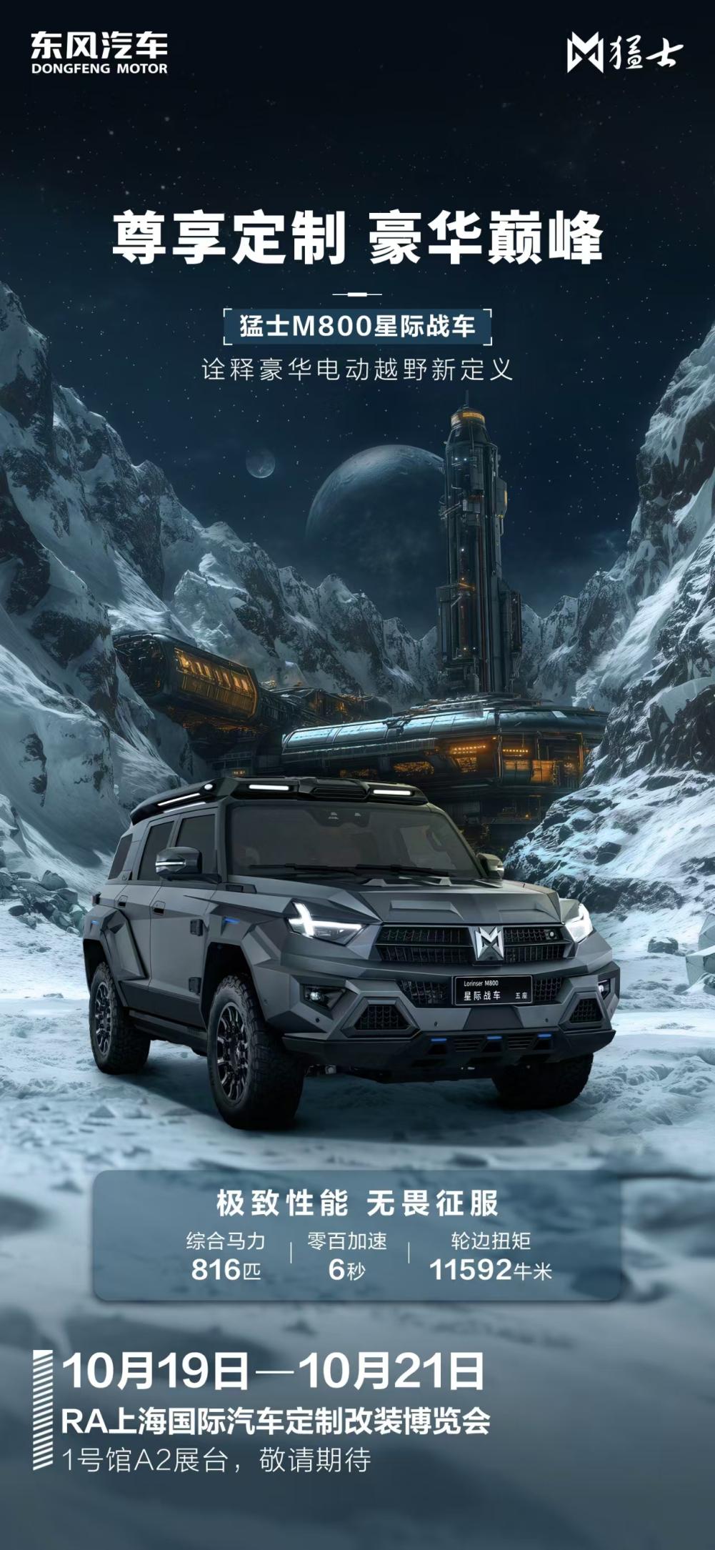 2024年10月19日-10月21日,第20届RA上海国际汽车定制改装博览会将于上海世博展览馆隆重开幕,由东风猛士科技和罗伦士联手打造的东风猛士M800星际战车届时将重磅亮相展会现场,引领广大消费者感受东方豪华电动越野的极致魅力,见证越野改装的更多可能。
