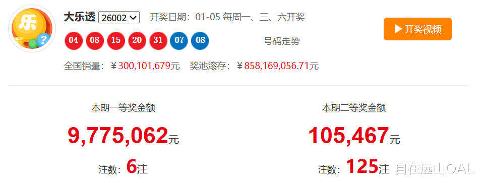 2026年01月05日,大乐透第26002期开奖结果出炉,前区号码为04、08、15、20、31,后区号码为07、08。本期全国共开出一等奖6注,单注奖金高达977万元,二等奖125注,单注奖金10.5万元。本期销量为2.87亿元,奖池滚存至8.23亿元,为下期开奖积累了丰厚的奖金基础。