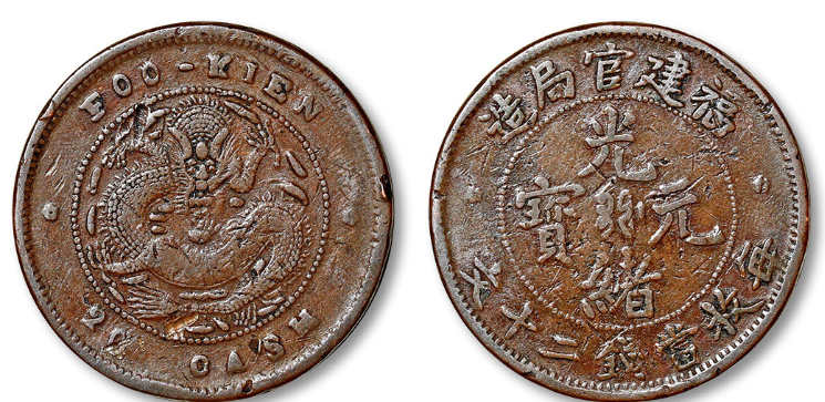 拍品描述:福建官局造光绪元宝二十文铜元,属清代闽省铜元的核心品类。币面中央为 “光绪元宝” 四字,字体端正舒展,上缘 “福建官局造”,下缘标注 “每枚当钱二十文”,文字间的装饰纹路虽经岁月仍显规整。币背为坐龙纹,龙身鳞片排列细密,龙爪遒劲有力,外环英文 “FOO-KIEN” 及币值标识,龙纹与文字的呼应尽显晚清铸币的工艺水准。此币铜质熟旧,呈醇厚的巧克力色包浆,币面虽有流通痕迹,但文字与龙纹的轮廓仍清晰可辨,磨损均匀自然,属流通美品。它铸于光绪年间,是福建官局造币厂为应对市面制钱短缺而铸发的通货,见证了晚清东南沿海的币制变革。在当前收藏市场中,福建官局造二十文因存世量相对适中、版别特征鲜明,成为清代铜元爱好者的热门藏品。