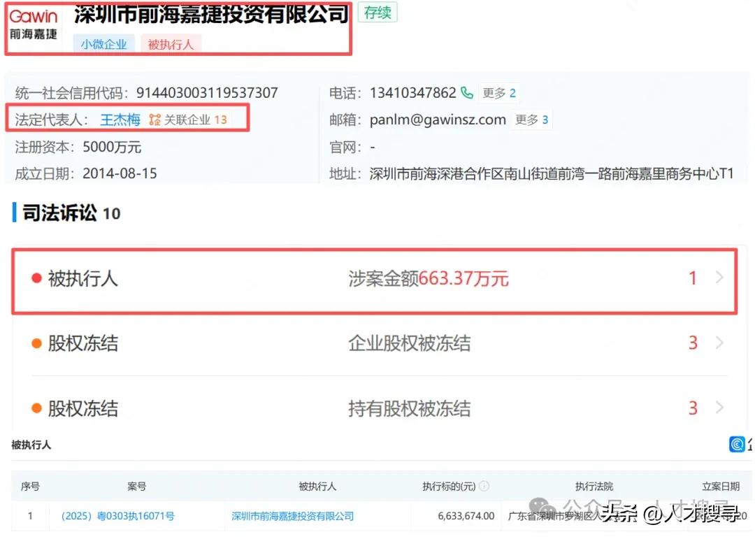 从企查查获悉,2014年8月15日成立的深圳市前海嘉捷投资有限公司,如今已经成为被执行人,公司由王杰梅100%控股。且被执行人涉案金额663.37万元。