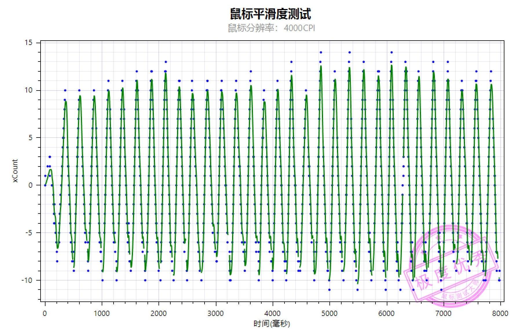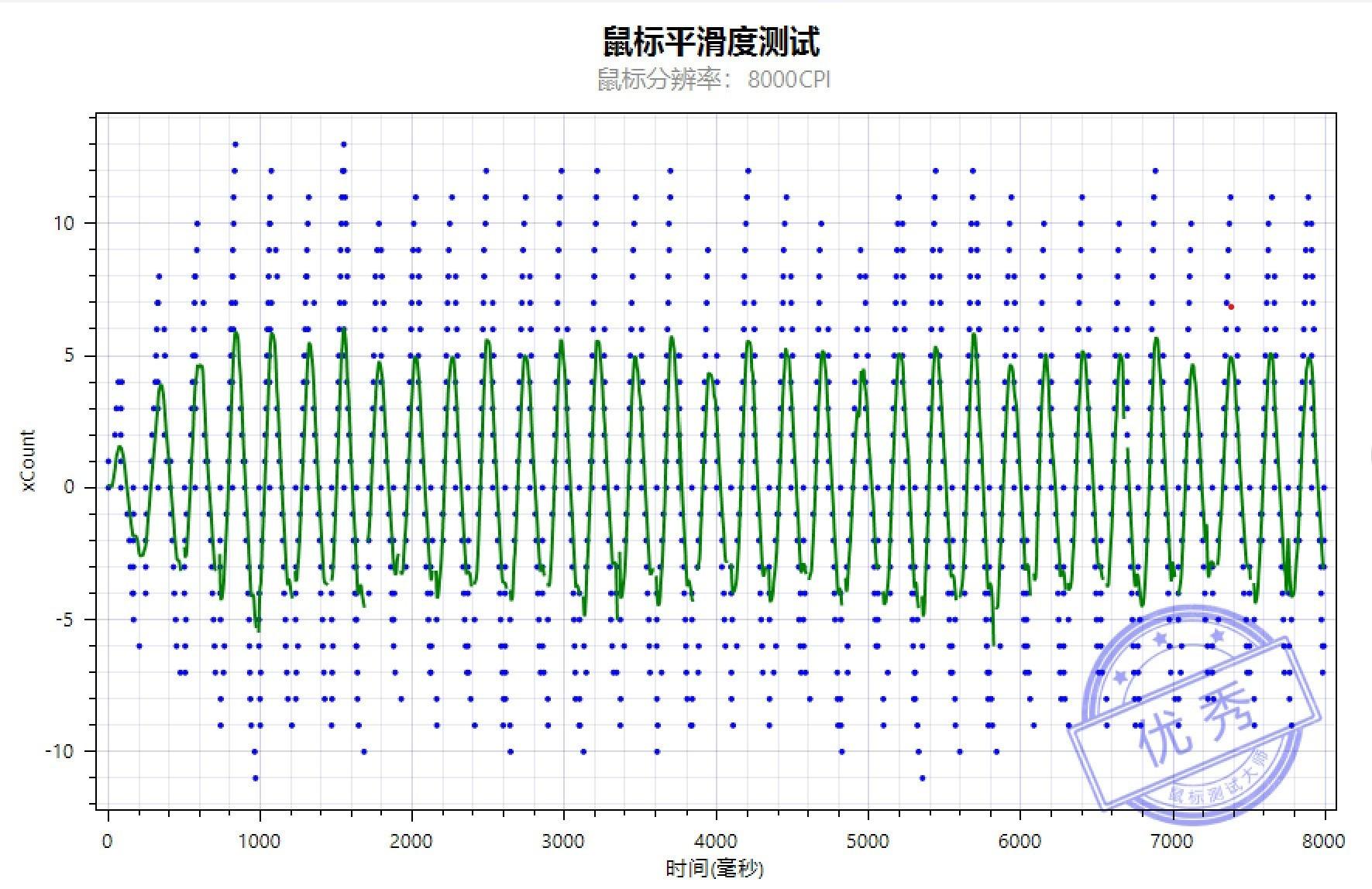 在4000CPI下,鼠标的平滑度测试非常出色,线和离散点的波峰较为贴合,给出了极度优秀的评价。