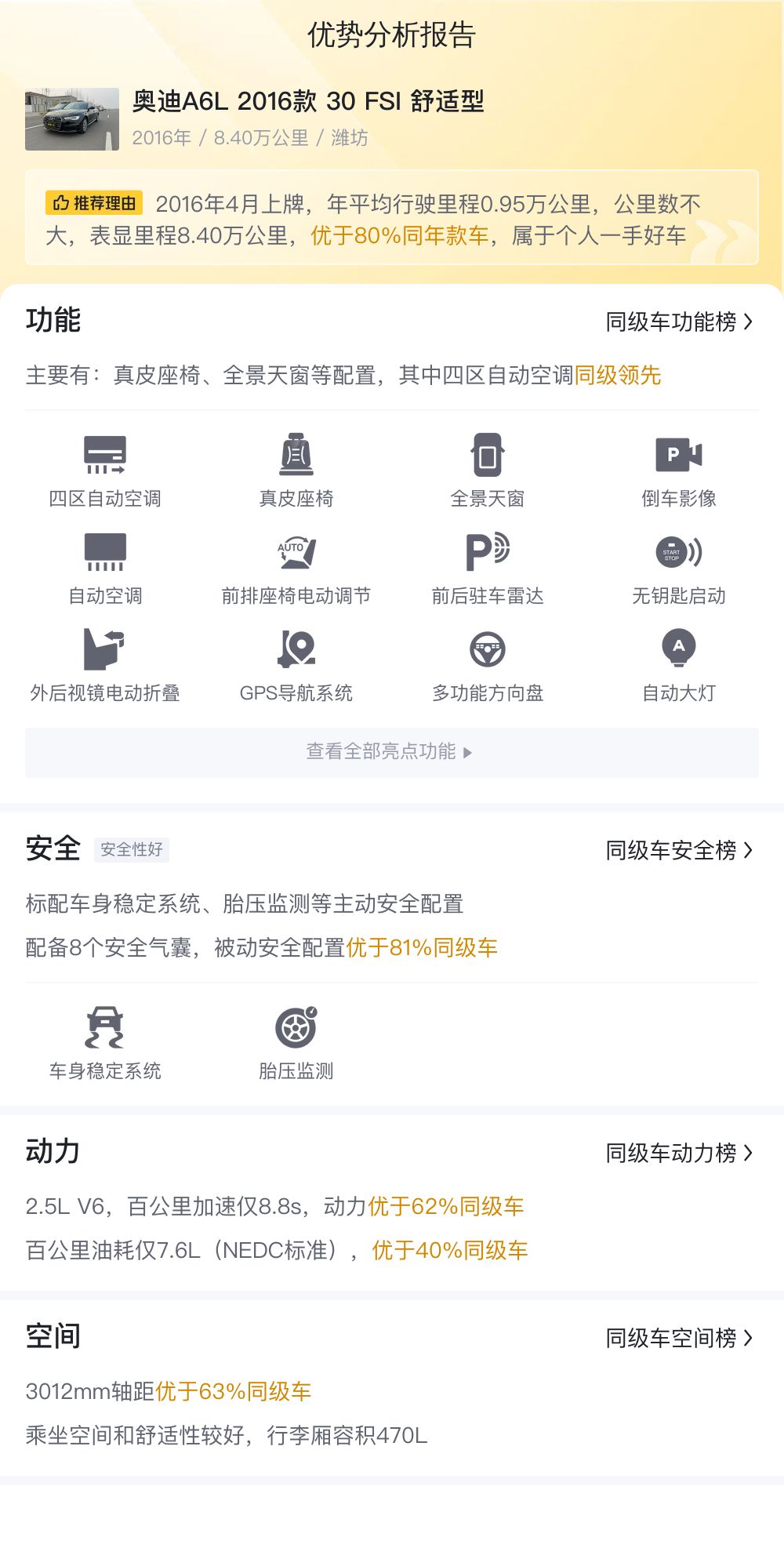 为了更清晰地向潜在买家展示这款车的竞争力,我们将其与市场上相似级别的车型在安全性、动力性能和舒适配置三个方面进行了对比。奥迪A6L 2016款 30 FSI 舒适型在对比中展现了出色的竞争力,特别是在某项关键指标上,它明显优于55%的同级车型。这一优势凸显了奥迪A6L在同级别车型中的领先地位,使其成为追求高品质出行体验的消费者的理想选择。