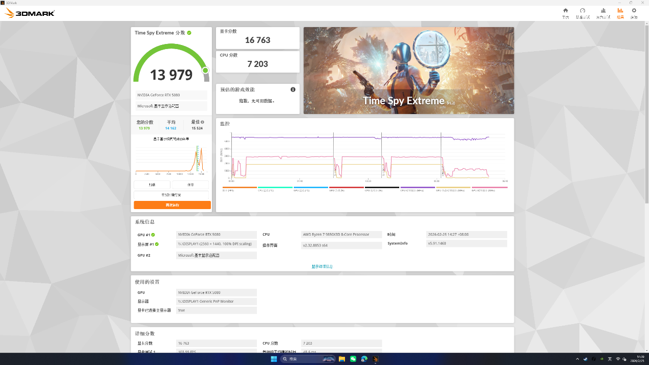 Time Spy Extreme得分13979,明显高于其他GeForce RTX 5080的平均水平。