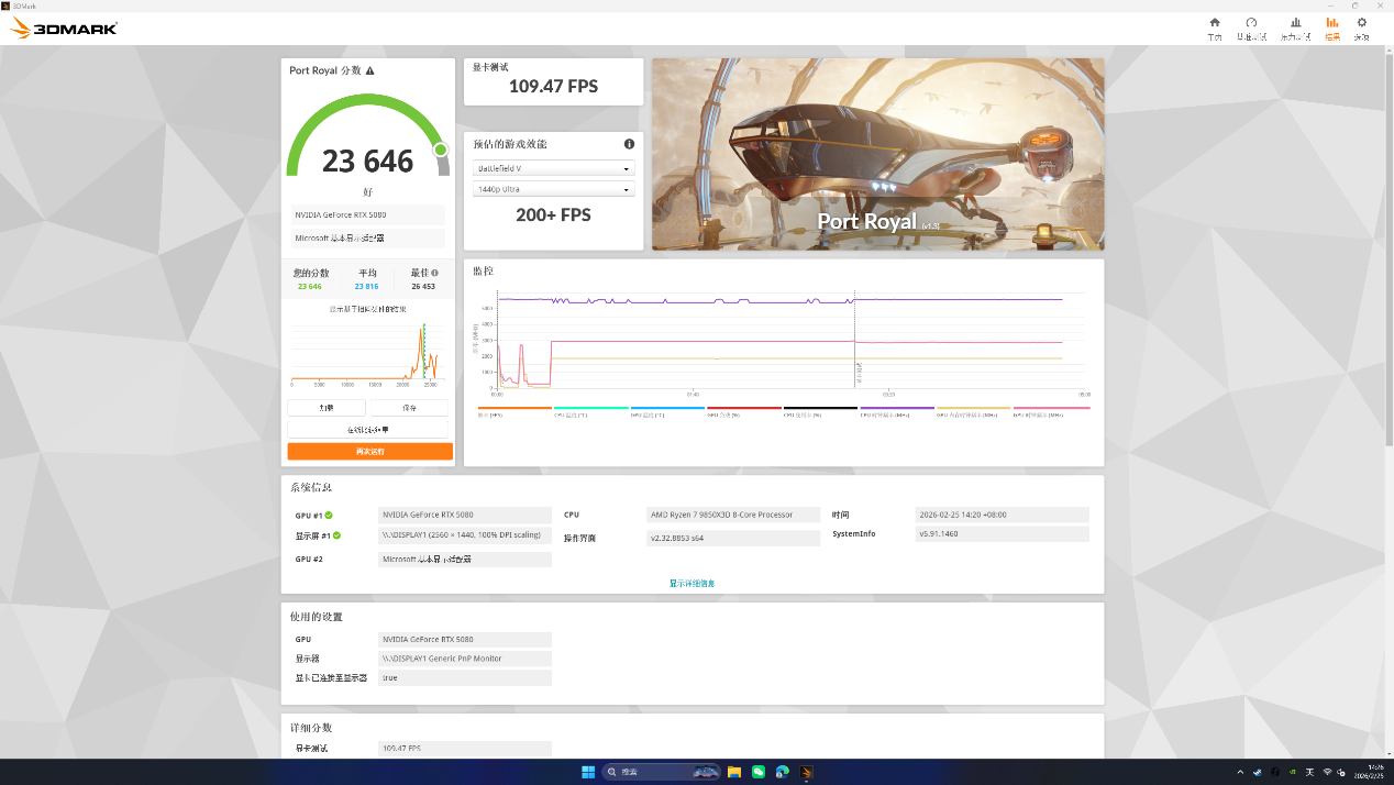 Port Royal光追测试得分23646,搭配DLSS 4技术在4K分辨率光追游戏下会有不错的体验。