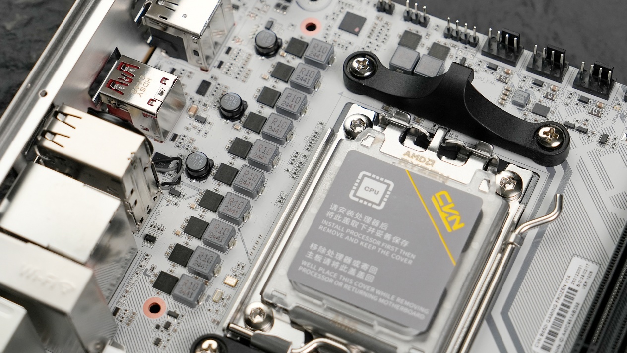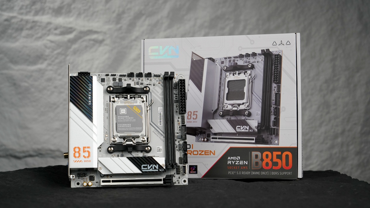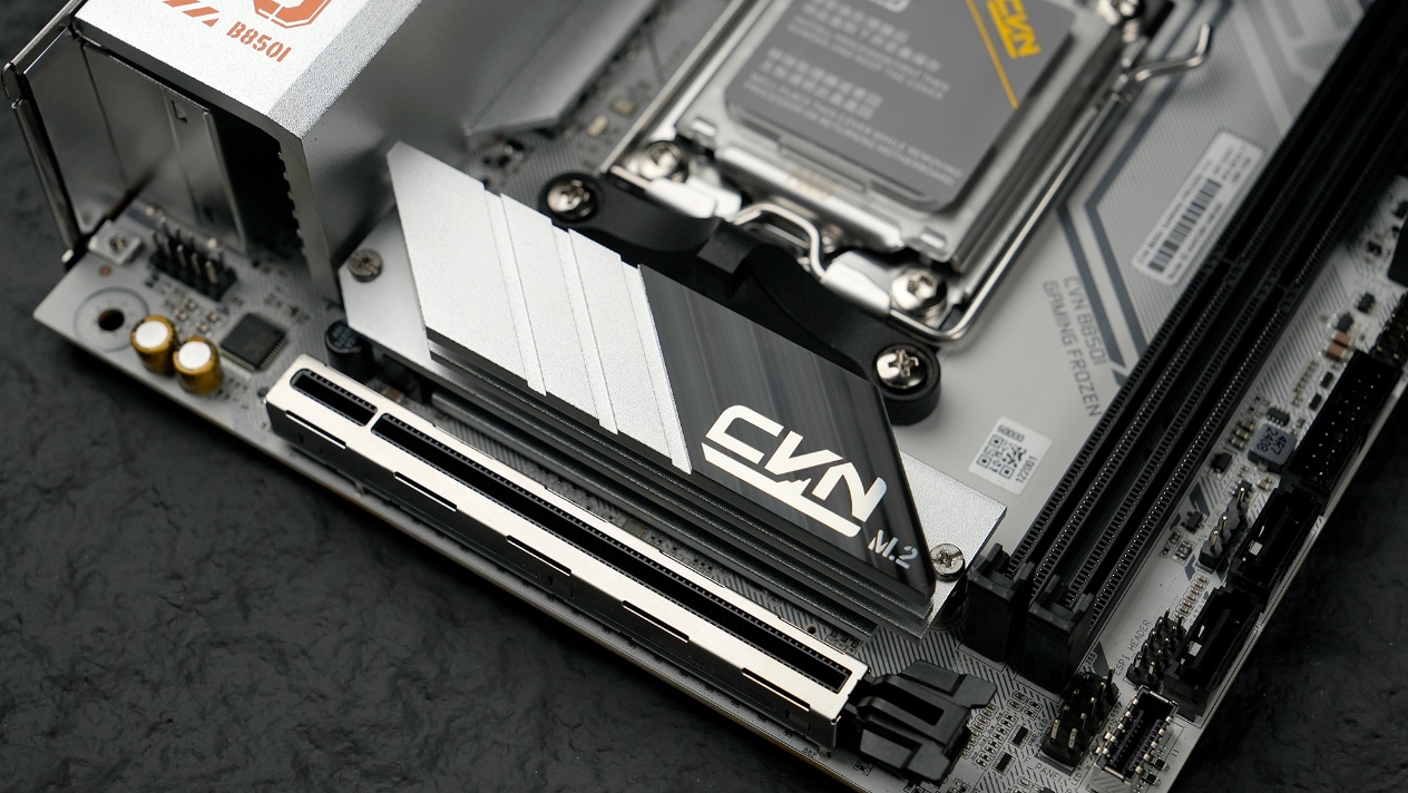 主板则是选择了七彩虹CVN B850I GAMING FROZEN登陆舰,延续CVN系列的军工设计风格和星舰元素,冷白色PCB与银灰色散热装甲结合,兼顾散热效率与硬核美感。