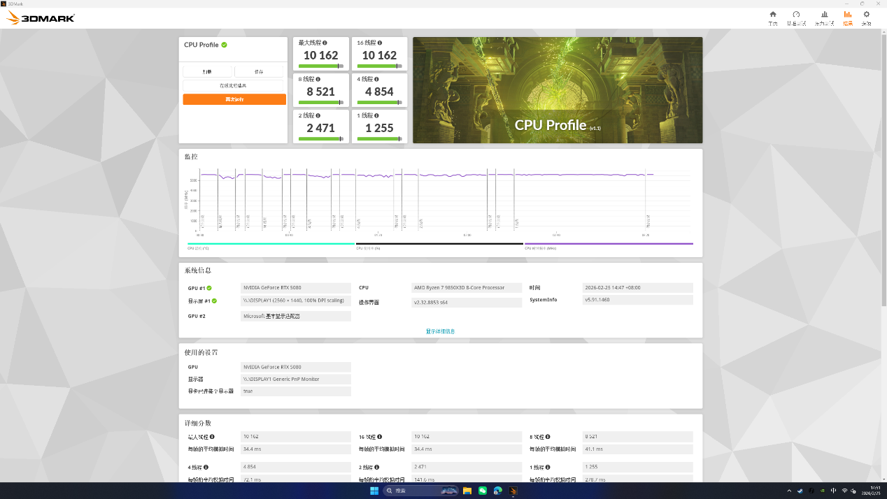 首先是侧重CPU性能的CPU Profile,最大线程以及最小线程得分符合9850X3D的常规表现。