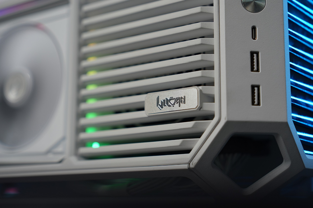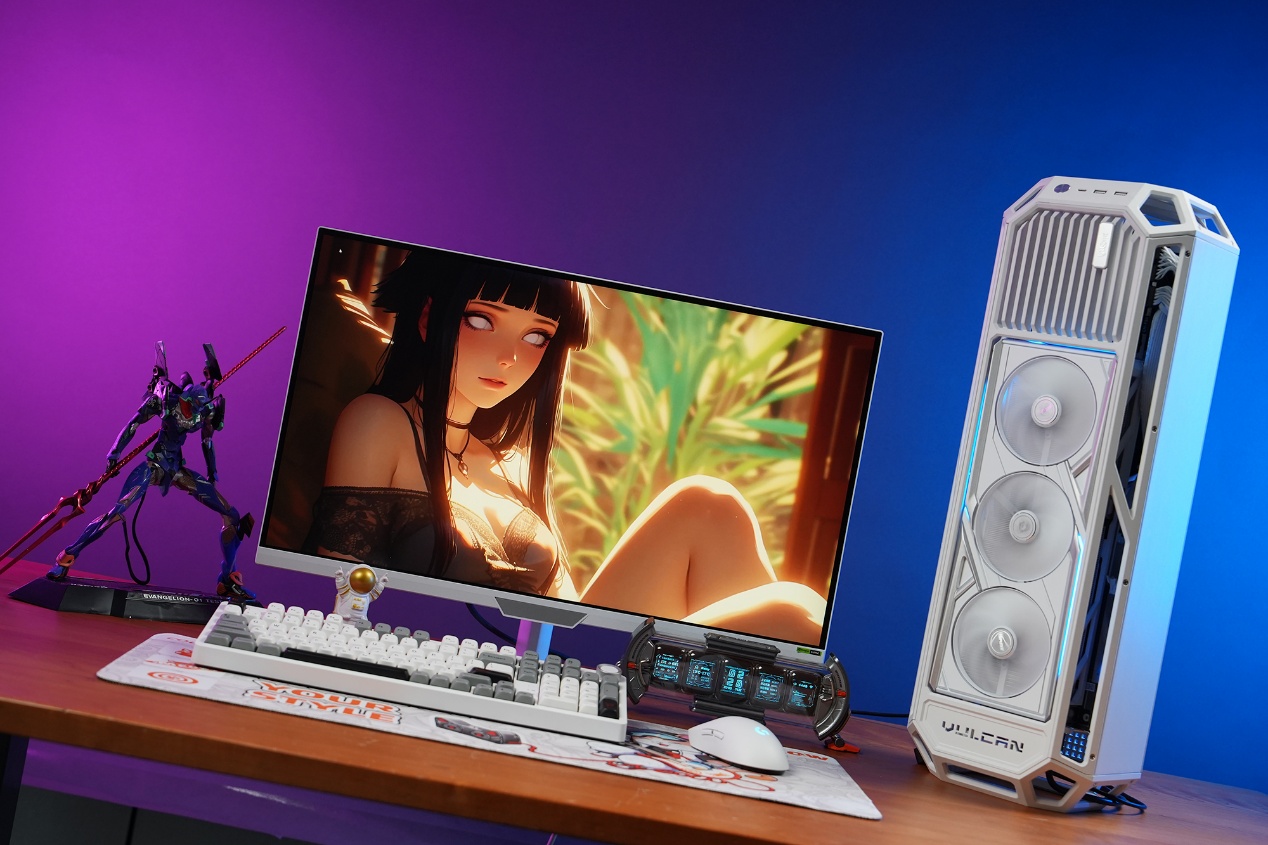 外观上,它以银白色全金属机甲外骨骼打造机身,和火神战甲机箱采用同款细腻喷涂工艺,质感与赛博设计语言完全统一,标志性的“白夜光刃”RGB灯效可与机箱全域同步,让整机颜值浑然一体,既是性能核心,也是桌面当之无愧的美学核心。