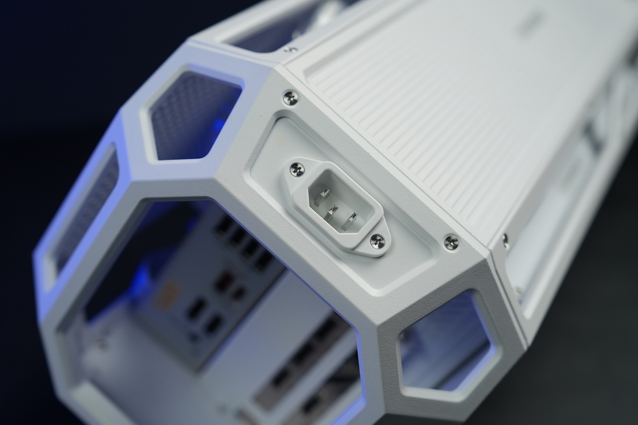 机箱后部的电源线接口支持拆卸更换,标配90度弯头侧出AC电源线,如果你追求极致的视觉整洁,也可以把接口从尾部延长,彻底隐藏线材,保证整机背面的一体性。