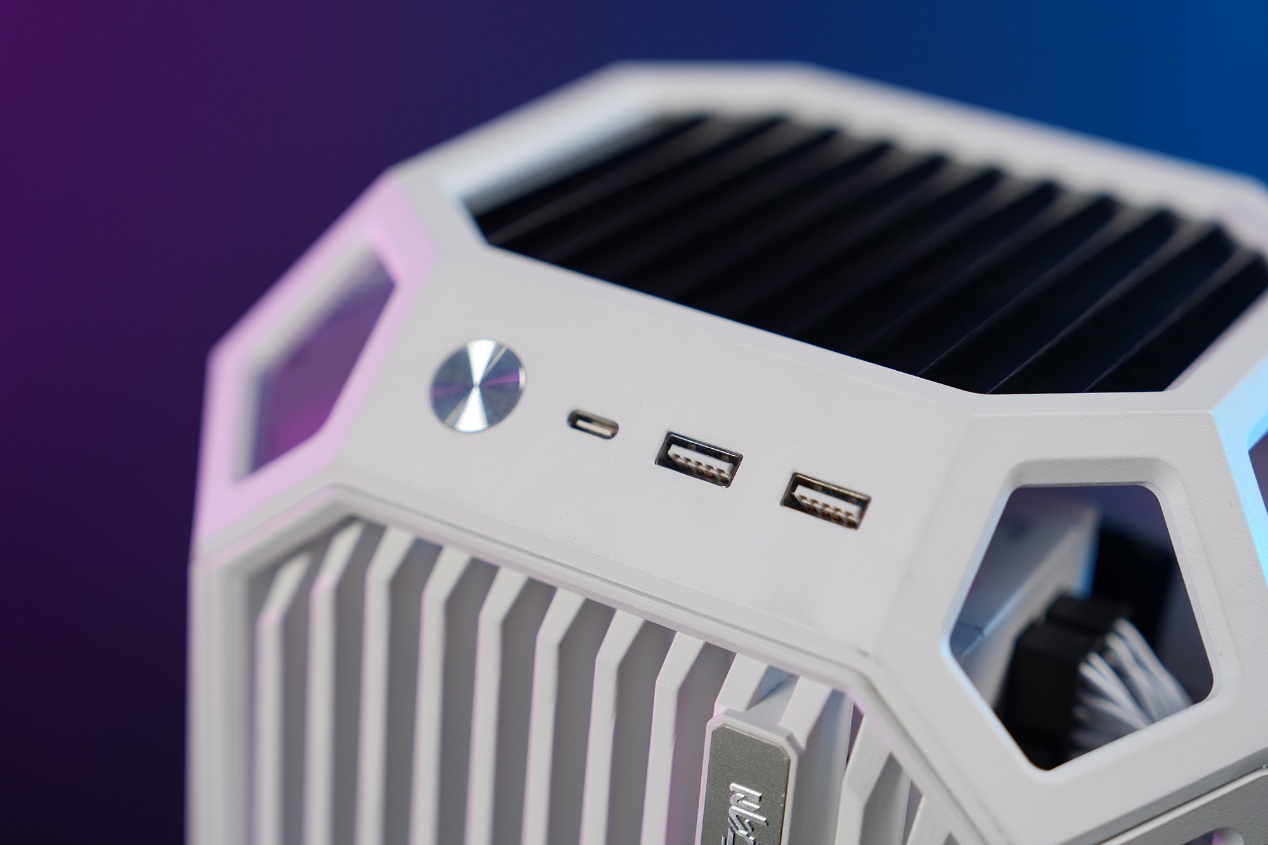 前面板配备2个USB-A 3.0接口、1个20Gbps高速USB-C 3.2接口,搭配铝合金CD纹开机按键,日常插U盘、外接耳机、高速传文件都非常方便,不用弯腰去机箱后面找接口。