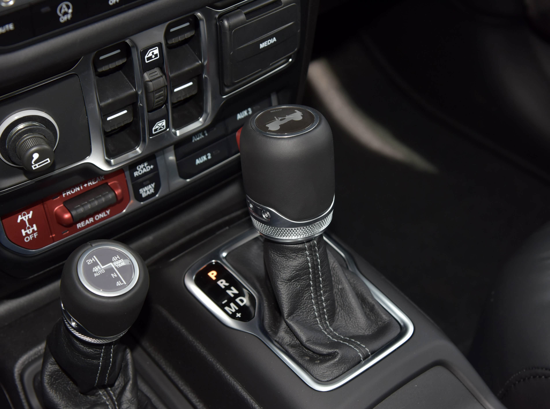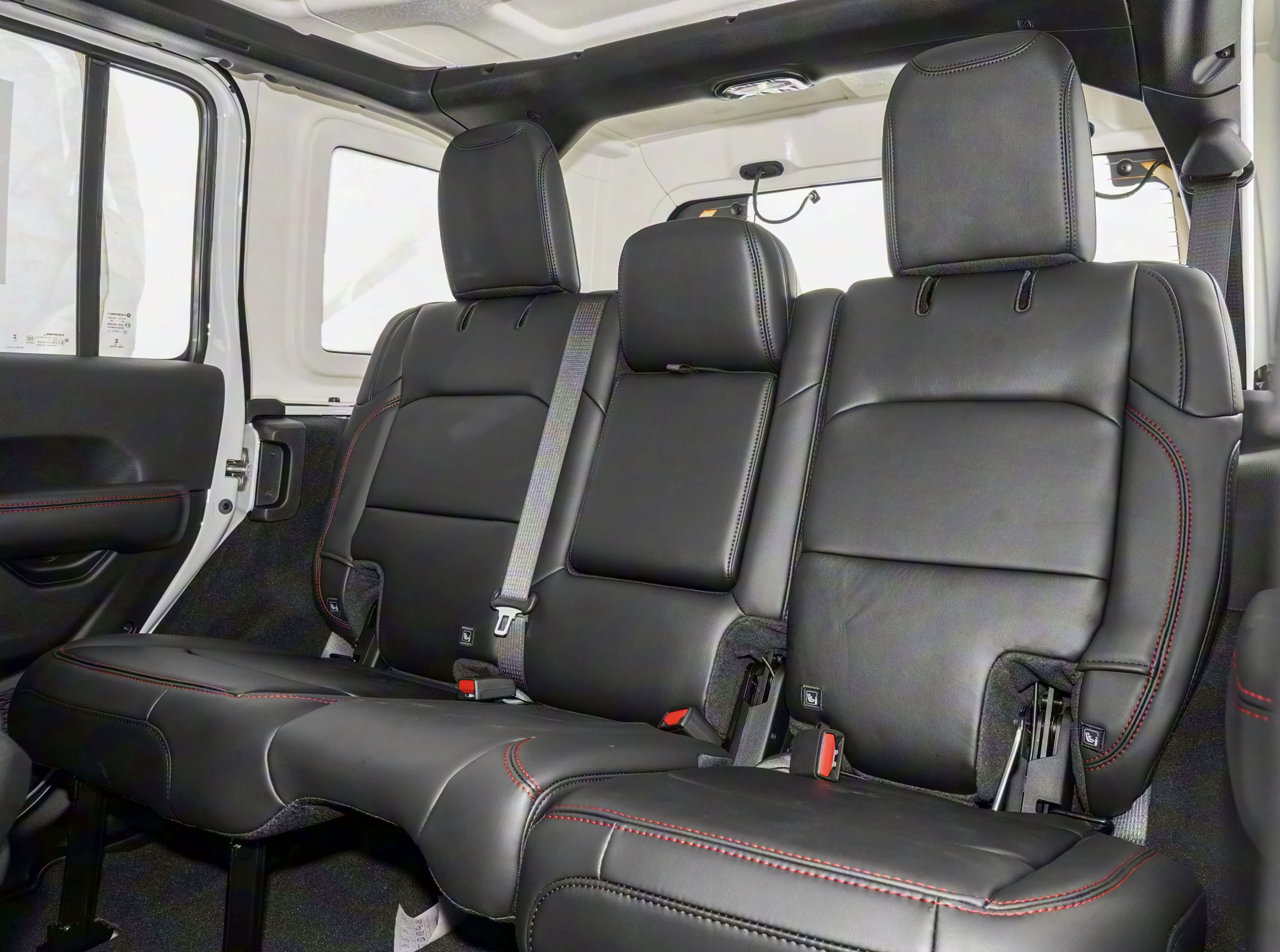 Jeep牧马人Whitecap特别版车内也采用了黑色的白色鲜明的撞色搭配,黑色为主的真皮材质包裹,还有白色Alcantara面料的交替铺陈。配备了黑色的真皮沙发座椅,还针对后排座椅靠背加入了4档可调的区间,提升了乘坐的舒适性,充分照顾到了车内乘客的体验。标准的T字形中控台配备了经典的三辐式多功能方向盘,银质的金属边框也让整车更有质感。操控岛配备了一大一小两个换挡杆,一个负责驱动模式的切换,一个负责挡位的调节,并拥有实用性更强的点烟器、差速锁,并保留了大量大颗粒实体物理按键。还配备了炮筒式空调出风口。科技感方面,该车配备了双筒机械指针设计,仪表中间为液晶屏。
