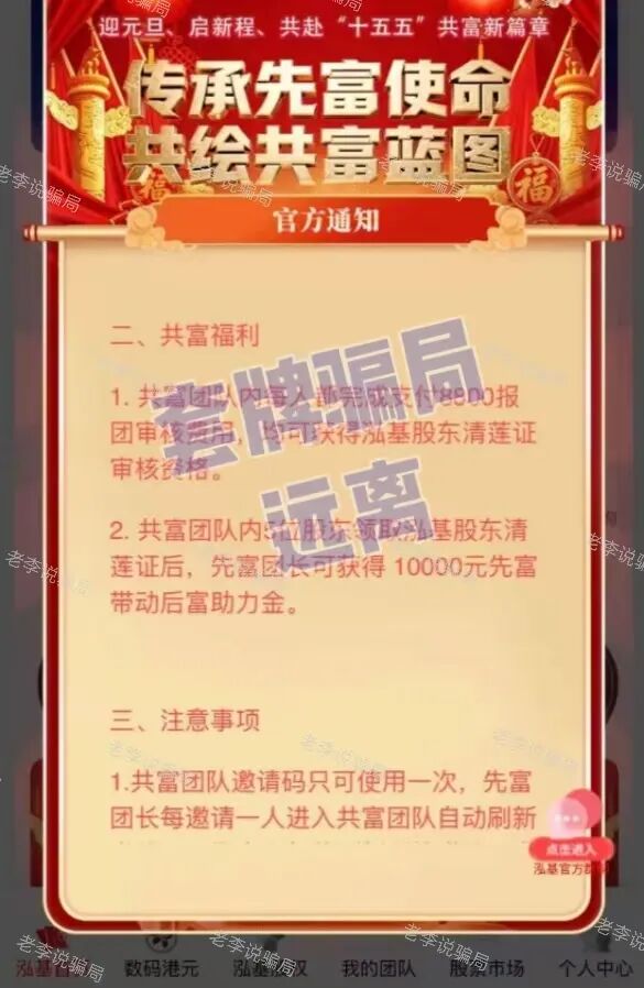打着央企“新时代”公司名义,通过各种东拼西凑的视频、新闻,谎称国家项目。宣称投资1份3800元,10份38000元出局可赚500万元。近日更是以“平债”为名吸引新人。