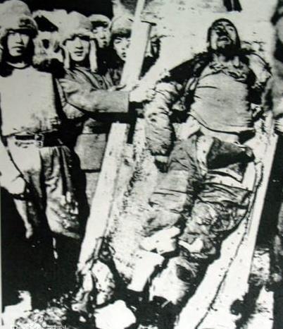 见杨靖宇拒不投降,日军兽性大发,时任通化省警务厅长岸谷隆一郎对其中一名汉奸说,“开枪,干掉他!”