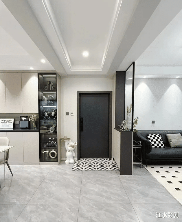 踏入家门,深邃的黑色映入眼帘,为空间增添了品位与质感。此设计不仅彰显主人品味,更营造出庄严、优雅的氛围。门边墙壁上悬挂的抽象派油画,为入口处注入独特的艺术气息,使家更加丰富多彩。