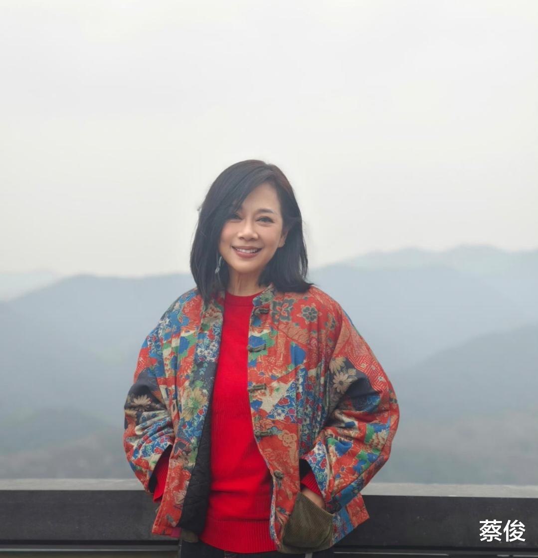照片中,她身穿红色上衣搭配中式外套和黑色裤子,女神范十足。
