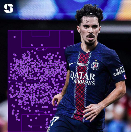 2024-25赛季是维蒂尼亚天赋完整兑现的一个赛季。在法甲单场做到了15次长传且15次成功,在欧冠淘汰赛两回合的单场完成了传球次数均超过100次的壮举,整个欧冠征途中完成1294次传球,成功率达到93.63%,在世俱杯上做到了三个极致的第一名——单场115次触球、累计41次抢断、累计711次传球。