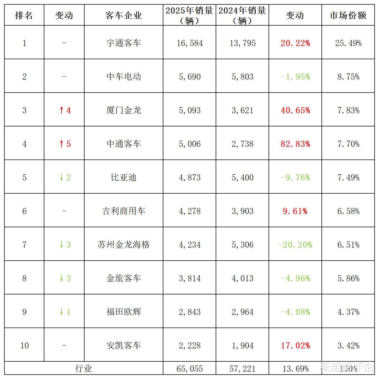 宇通客车蝉联榜首,销量同比上升20.22%至16584辆,是唯一破万的车企,市场占比25.49%,进一步扩大领先优势(同比提升1.39个百分点),比2-4名总和还要多。截至2025年底,新能源客车累计销量超过21万辆。
