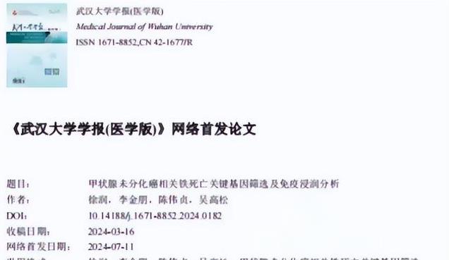 [1]徐润.甲状腺未分化癌相关铁死亡关键基因筛选及免疫浸润分析,武汉大学学报(医学版),2024-07-11