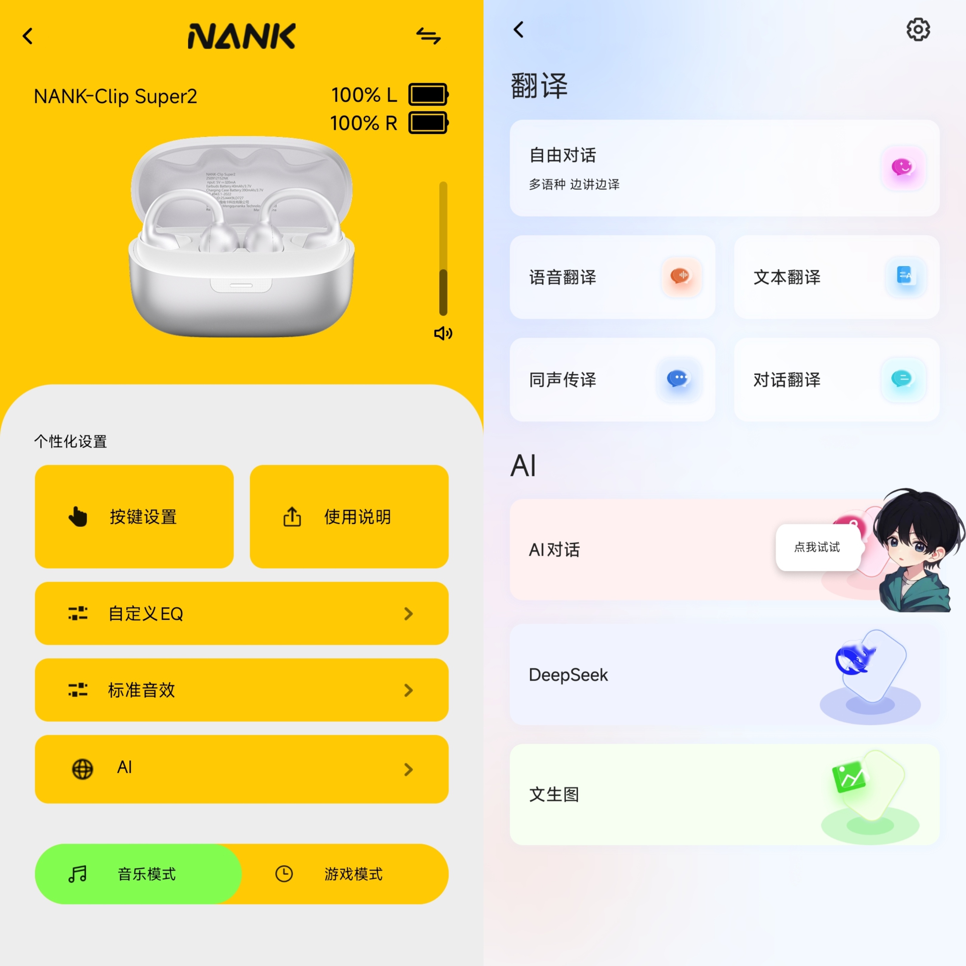 当下AI的密切融入日常,在粘性最大的耳机上更有助于习惯的养成,NANK南卡 Clip Super2集成讯飞、DeepSeek等多模态AI智能系统,汇聚AI翻译、 AI对话、AI语音助手、AI生成内容、AI深度搜索等能力。无论是跨国沟通、学习陪伴、商务记录,还是生活场景,你想 要的智能功能,一副耳机全包办,真正实现听歌与智能的融合体验。