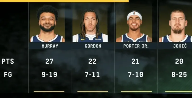 全场比赛,掘金队 4 人得分 20+,穆雷砍下 27 分 8 助攻,在关键时刻用稳定的得分和出色的组织盘活球队;戈登贡献 22 分 8 篮板,其在常规时间最后时刻的关键三分以及加时赛中的高效表现,堪称球队获胜的重要功臣,不负约基奇最好的队友之称;小波特也有 21 分 8 篮板入账;约基奇则得到 20 分 16 篮板 6 助攻,尽管失误较多,但在篮板球和组织串联方面依旧为球队做出了贡献。雷霆队虽然杰伦・威廉姆斯空砍 32 分,但亚历山大 22 投仅 7 中,末节和加时赛表现低迷,成为输球关键。