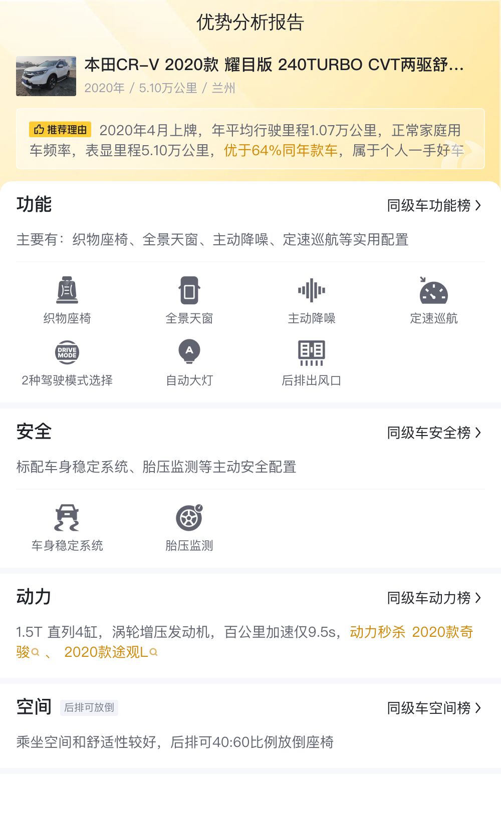 最后,为了帮助您更好地评估这辆车的整体情况,我们对比分析了这款车与同级别竞品车型在各方面表现,并制作成了图表,您可以重点关注一下。