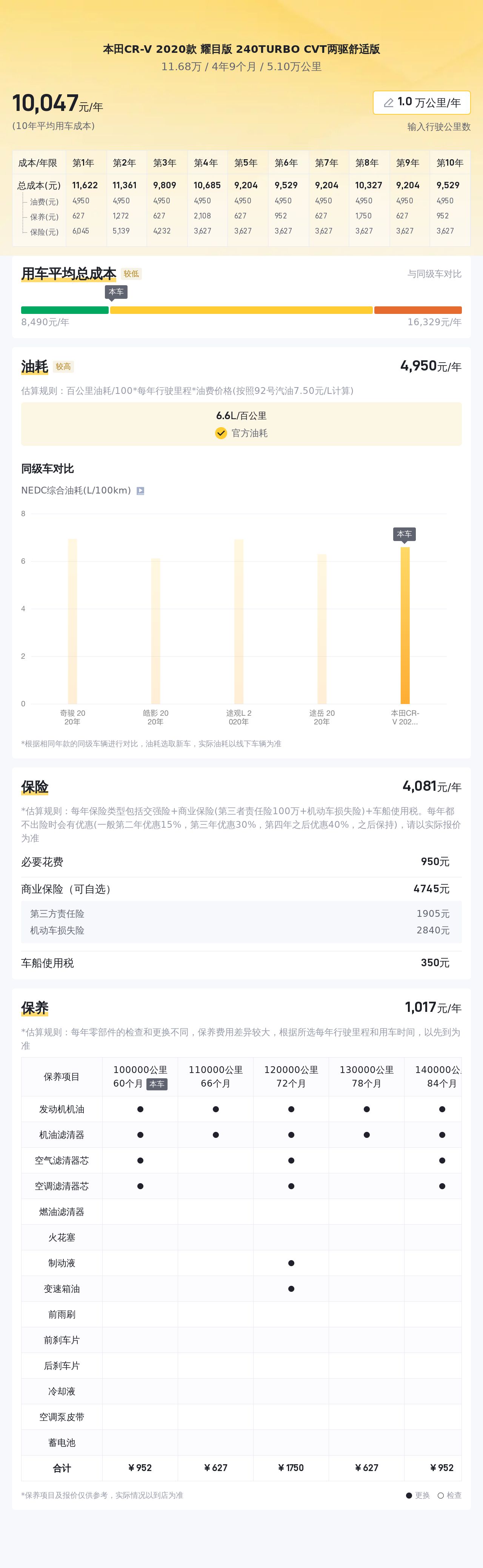 买车不是一锤子买卖,除了购车需要花费金钱外,日常使用和保养同样需要花钱。为了让您全面了解这款车的使用成本,我们以每年 2 万公里行驶里程为例,计算了这辆车的年度用车成本。当然,如果您开车少的话,成本肯定会更低。另外,保险和保养费用也会根据保险公司和保养项目的不同而有所差异。